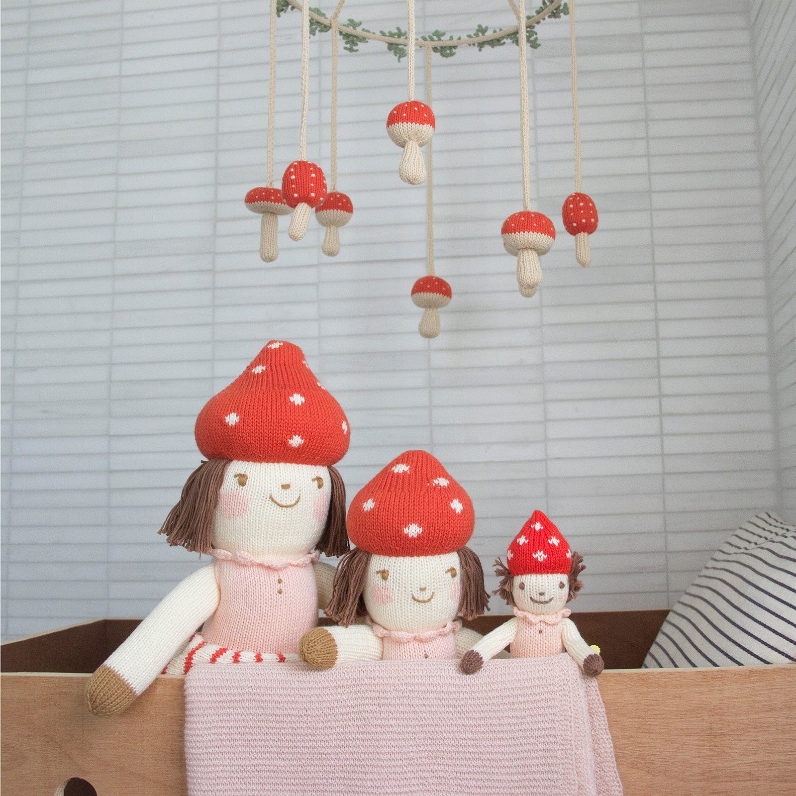 Perfectly whimsical and playfully charming! Hand-knit with little red amanita mushrooms and delicate green vines & leaves, it'll turn any room into a little forest oasis. Perfect for hanging over a crib, changing table, or any corner of your little one's room! You can never go wrong with a little mushroom décor!
